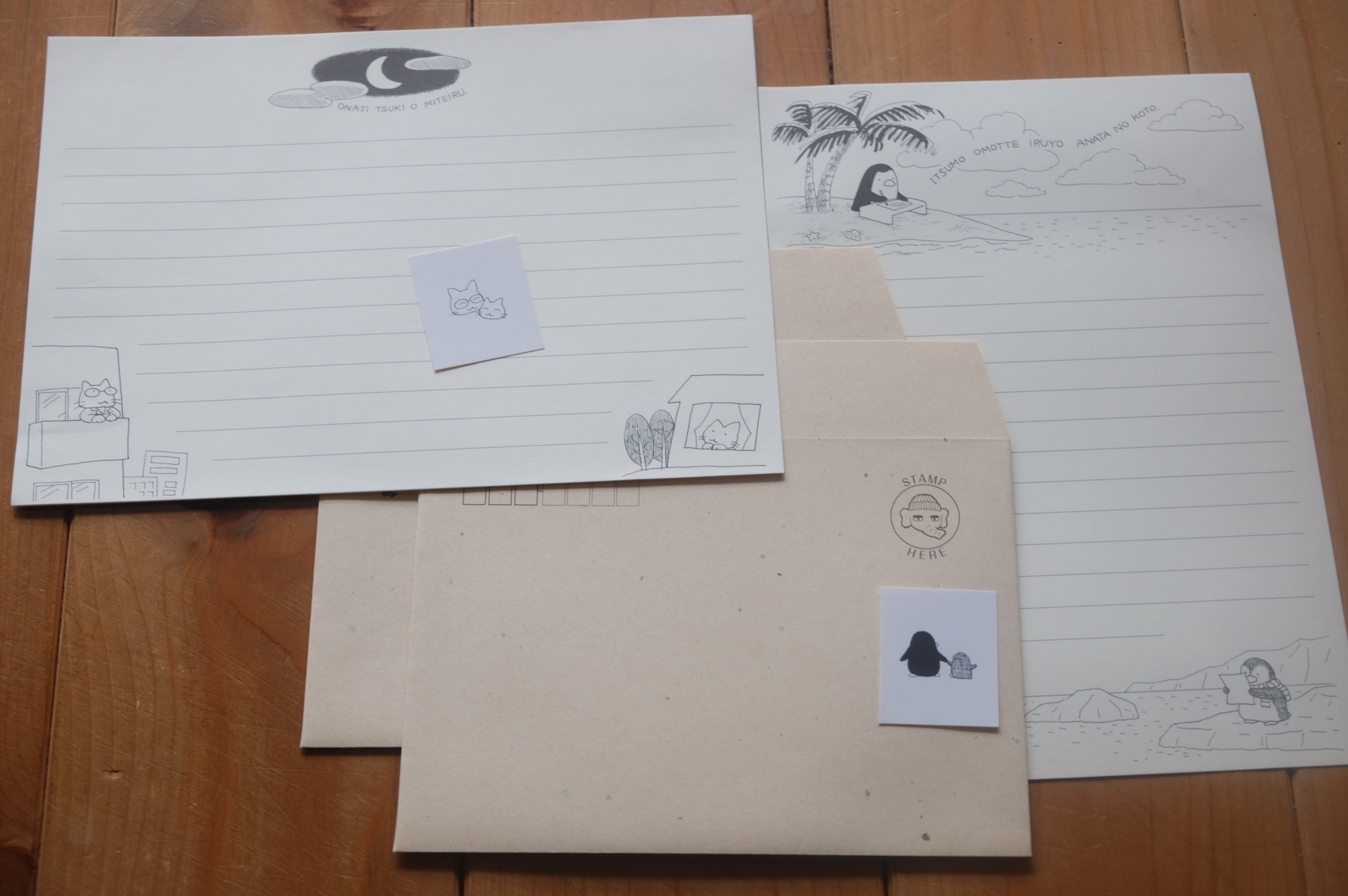 便せんにはペンギンとネコのイラストとITSUMO OMOTTE IRUYO ANTA NO KOTO、ONAJI TSUKI O MITERUの文字がデザイン化されている。